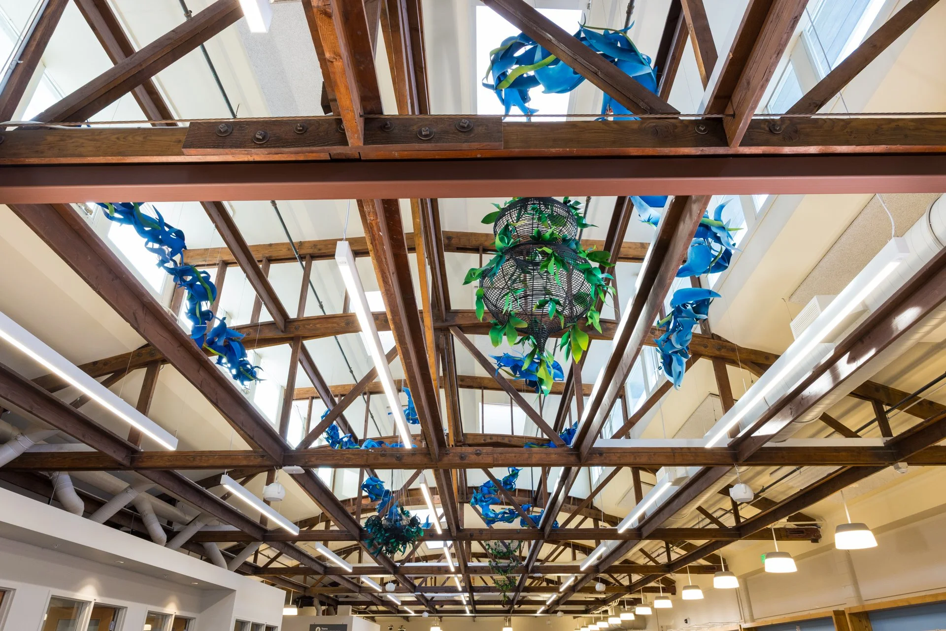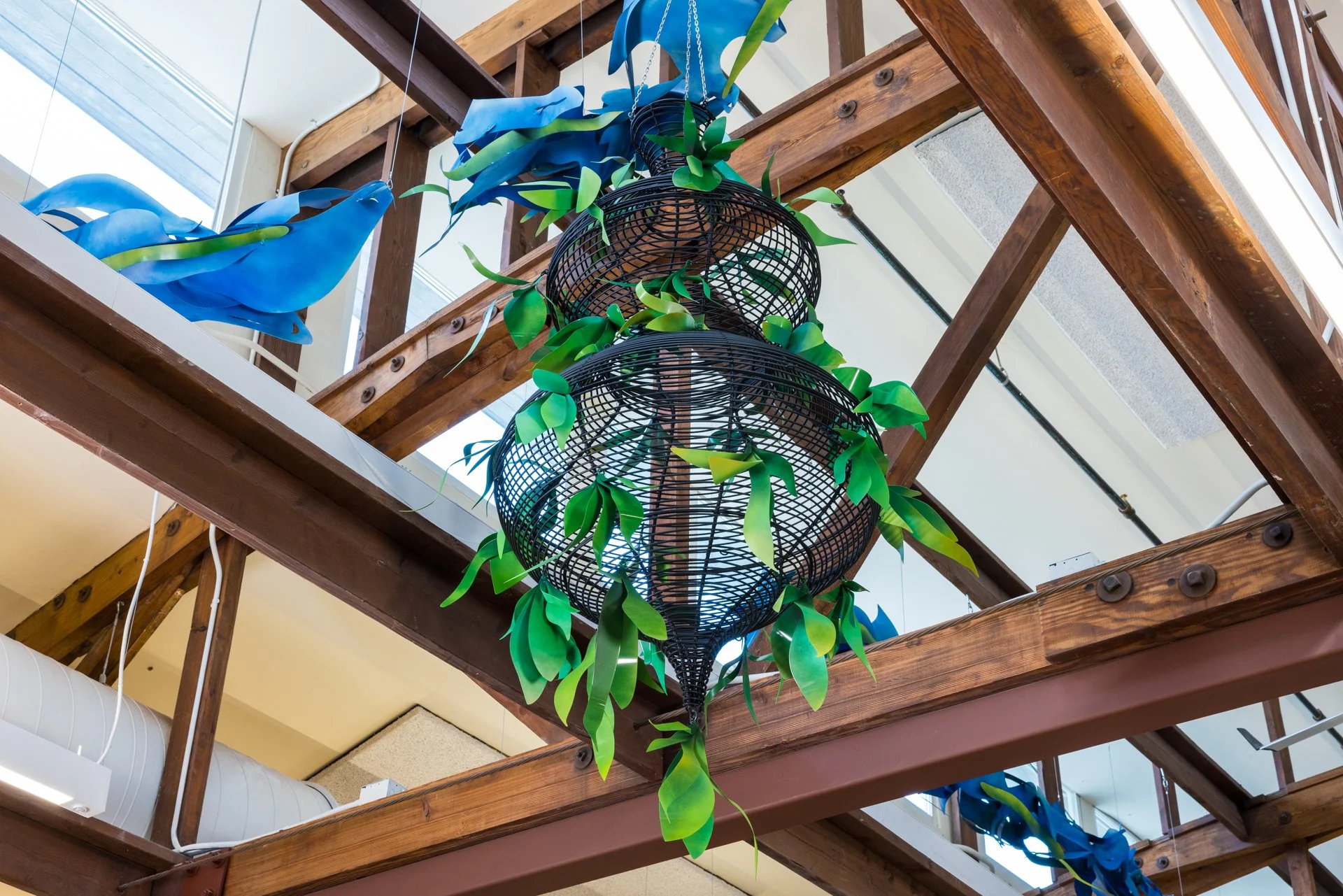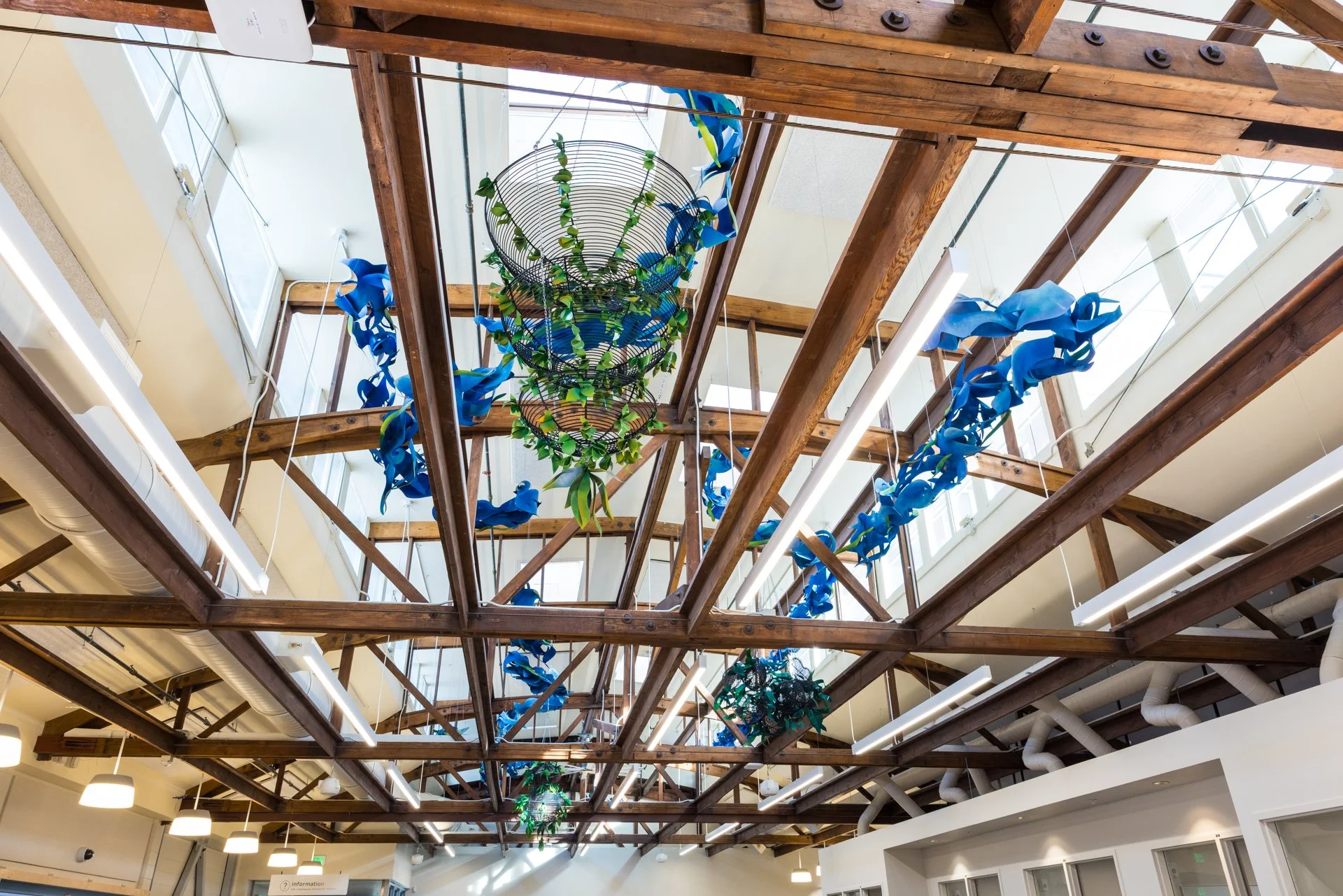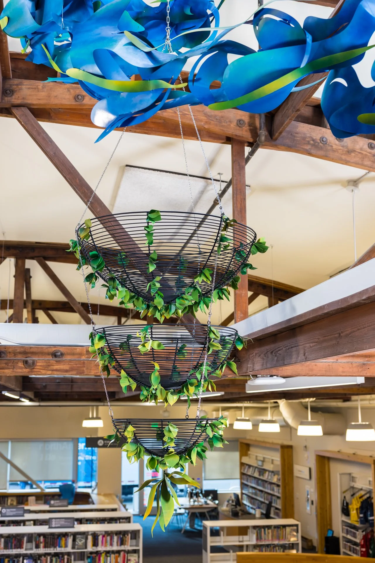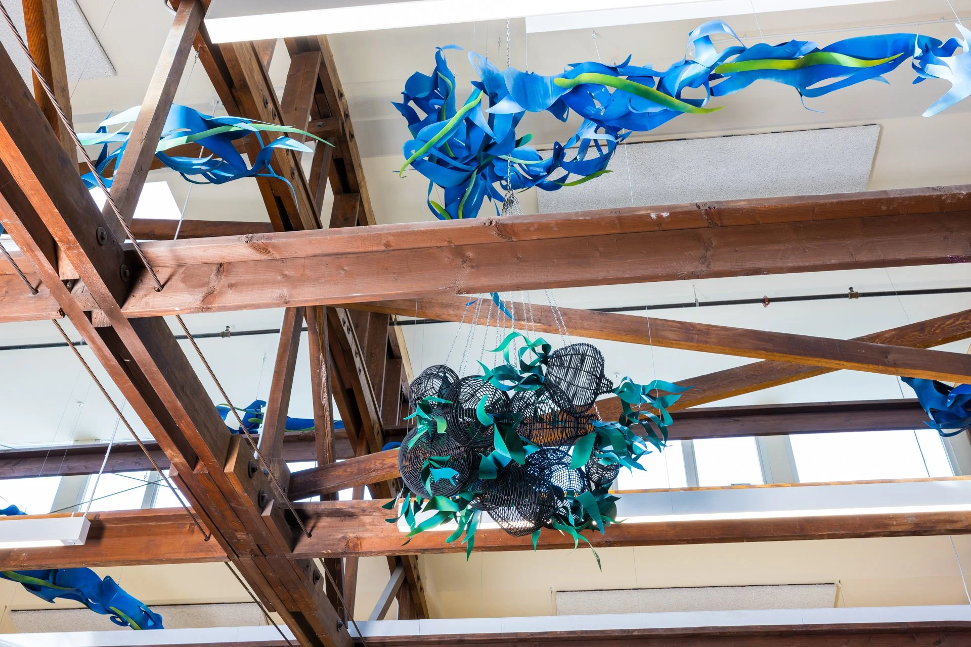 Drawing from these histories, I created Traces Woven. Three suspended basket-like forms honor the Native tradition of weaving for community use. Green leaves attached to the sculptures symbolize the crops Chinese immigrants grew to sustain both themselves and their neighbors. Interwoven among the sculptures and rafters are bird- and wave-like strands—echoes of the waterways that once ran through the region, and of the swirling flocks of swifts that continue to gather each year.