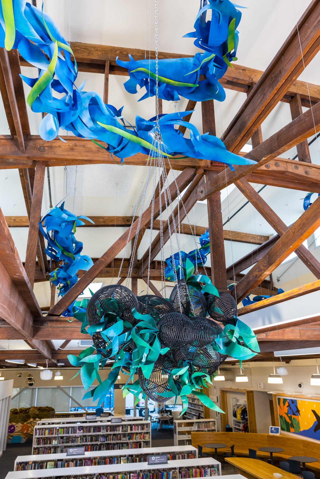 Suspended high above the library’s clerestory, the installation invites viewers to look upward, to remember, and to celebrate the people, waterways, and migrations that shaped Slabtown. The work reflects my artistic sensibility and my enduring interest in recovering and honoring the stories that came before us.